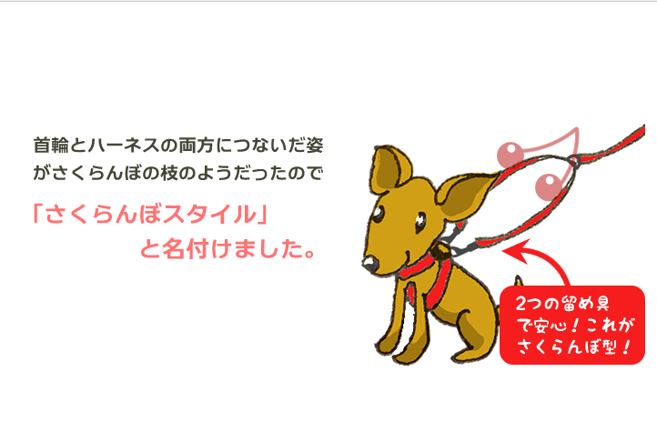 これは、リードを「首輪と胴輪(ハーネス)の両方につなぐ」つくりになっています。その姿が、まるで「さくらんぼの枝」のようだったのが名前の由来に。