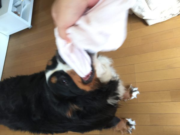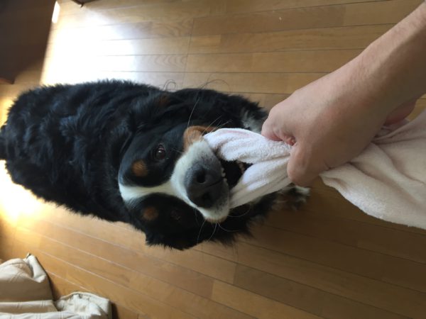 引っ張りロープを紛失して以来、いつも買って帰ろうと思って忘れるので、今回もタオルで遊ぶ。