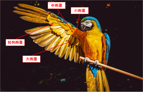 大雨覆、中雨覆、小雨覆、初列雨覆の四つの部分に分かれており、羽へ当たる空気の流れを整えたり、風切羽を頑丈に支えている役割があると考えられています。