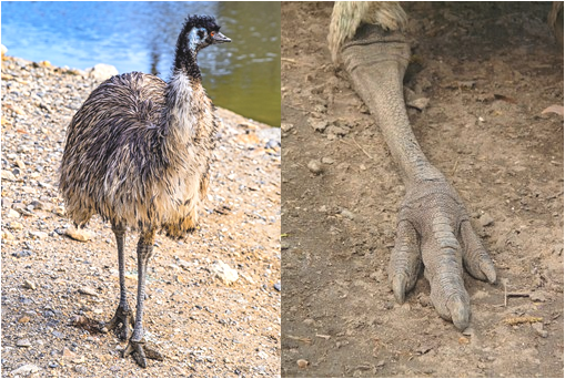 三趾足(さんしそく)は、第1趾「後趾」が退化し、第2指「内趾」、第3趾「中趾」、第4趾「外趾」の3本のみで構成されています。エミューがこの趾の形をしており、ダチョウは二趾足(にしそく)のため、エミューとダチョウの大きな違いでもあります。