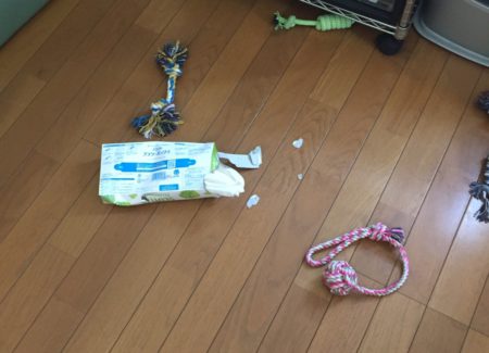そして、お墓参りで少し留守番させている間に、今度はティッシュ箱をおもちゃにしていました・・σ(^_^;)