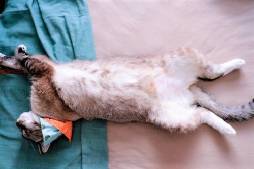 このポーズは野良猫や野生の動物でも見られることはありますが、本来弱点であるお腹を晒している無防備な姿ですので、安心できる場所でリラックスしている状態と考えられます。