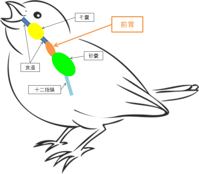 鳥類には胃が2つあり、前の胃を「前胃(ぜんい)」、後ろの胃を「砂嚢(さのう)」と呼びます。