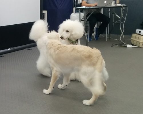 まずは室内で、犬の言語ともいえる「カーミングシグナル」を学んでいきます。