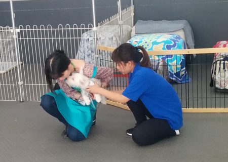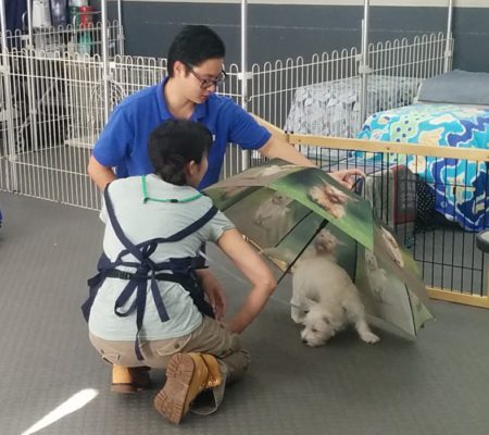この実習では社会化期の子犬たちへのアプローチ方法や、トレーニングを学んでいきます。