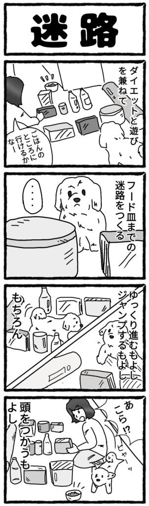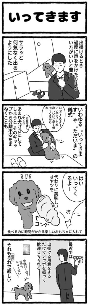 ペット四コマ漫画~その13~ ペット四コマ漫画 Tweet シェア ペットシッターやペットのあれこれを描いた四コマ漫画です。 工夫ひとつで食事もアトラクション^^ 「いってきます」はWin-Winの関係でスマートに 小さなハンターは主人を傷だらけにする 長めの散歩で共にカロリー消費を^^ 長っ!!とびっくりするのも猫の魅力 ⇒2019.10.02「クッションのような『四角い猫』現る」 Tweet シェア