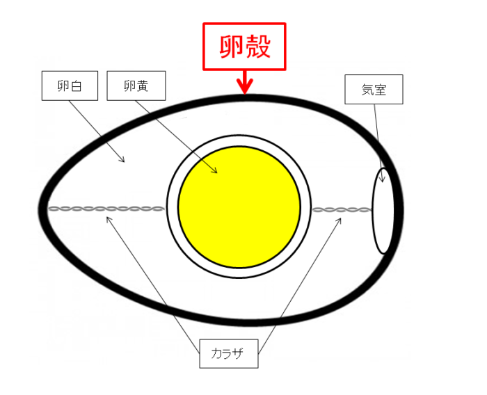 卵殻(らんかく)とは卵の外側の殻のことで、内部を保護する役目を持っています。ほぼ炭酸カルシウムで出来ていて、気孔と呼ばれる小さな穴が無数に空いており、この小さな穴から内部の炭酸ガスを出し、外の酸素を取り入れたりしています。