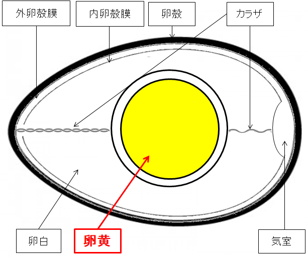 卵黄は(らんおう)は「黄身」とも呼ばれ、水分50%、残りは脂質やタンパク質から出来ており、卵の中の胚が成長する際の栄養となります。