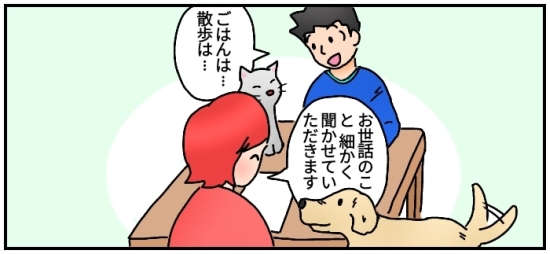 普段どのようなお世話をしているのか、どこに何があり、緊急の場合はどうするのか、またペットの性格や好きなもの(苦手なもの)、お散歩時の注意や細かなケア方法、ものの保管場所など、直接お伺いして時間をかけた「お打合せ」をしてこそ、本来のペットファーストのサービスが履行できます。