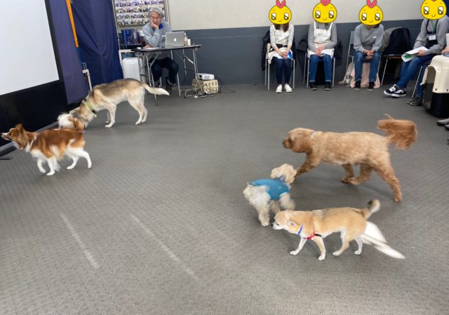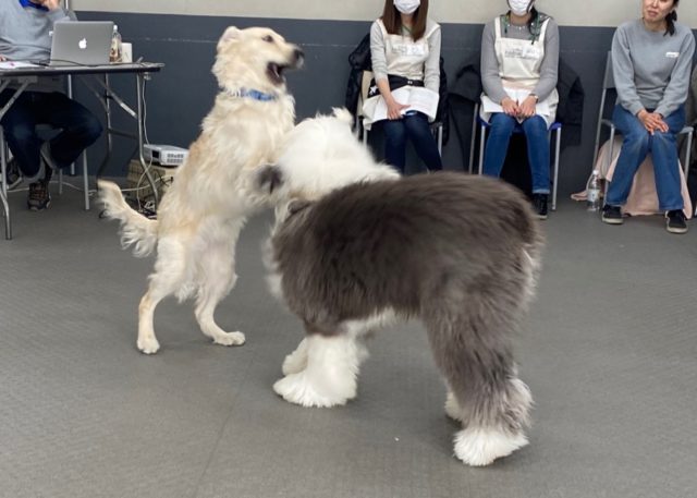 犬同士のカーミングシグナルを見る授業で、ただじゃれてる、遊んでる、ではなく、ぐいぐいくる犬に「落ち着いて!」と反応したり、「興奮しすぎたかな?ちょと落ち着かなきゃ」といった細かな犬の感情の変化を行動で読み取る授業です。