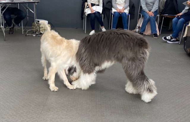 犬同士のカーミングシグナルを見る授業で、ただじゃれてる、遊んでる、ではなく、ぐいぐいくる犬に「落ち着いて!」と反応したり、「興奮しすぎたかな?ちょと落ち着かなきゃ」といった細かな犬の感情の変化を行動で読み取る授業です。