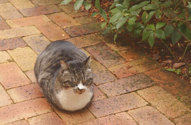 エジプト座りの応用で、「しっぽ巻き座り」というのもあります。写真の猫はしっぽをまっすぐに伸ばしていますが、しっぽ巻き座りはエジプト座りをしてからしっぽを体に巻きつけて座ります。おなか丸出し「スコ座り」。おじさん座りともいわれる