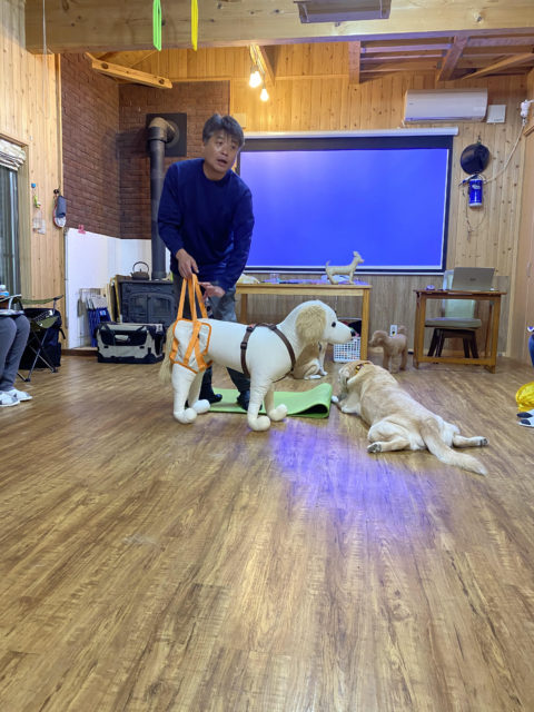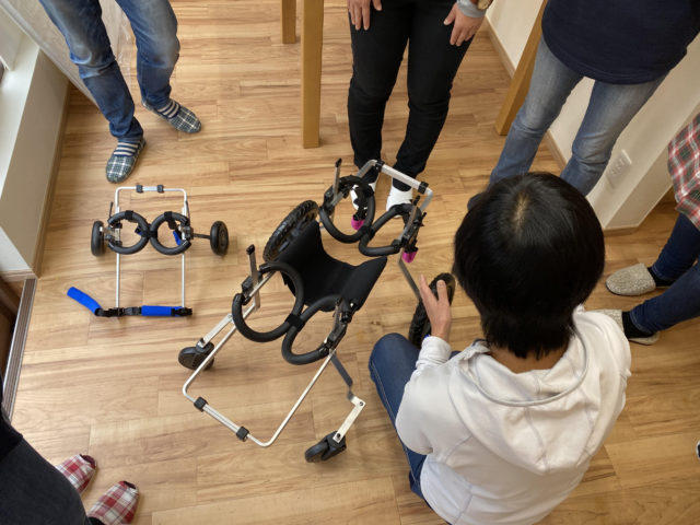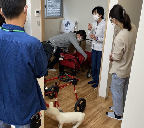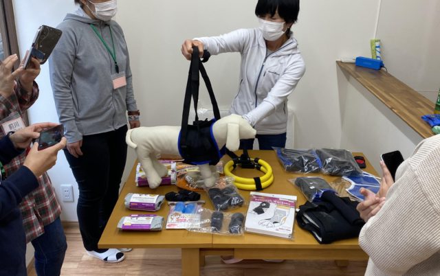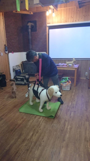 こちらは、昨日行われた「犬猫用車イス・介護用品」の実習風景です。