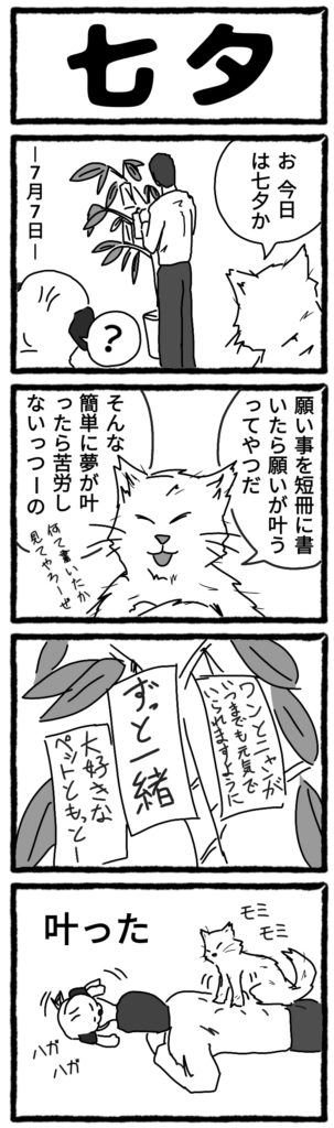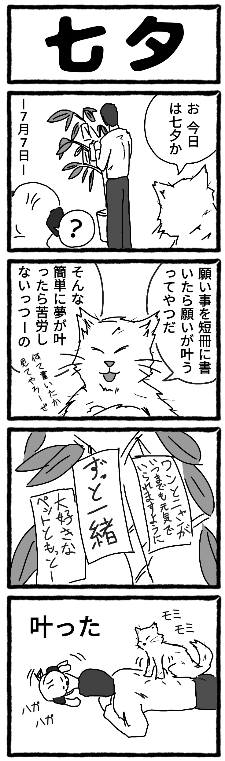 ペット四コマ漫画~その18~ ペット四コマ漫画 Tweet シェア ペットの四コマ漫画をお楽しみください。 土俵(ペットシート)の上ならま、いっか 毎日が七夕(笑) ⇒2020.07.07「七夕~あればいいなと「願う」ペットのサービス」 模様もパンチの鋭さも個性 せめてもう半回転(笑) 宝も桃もきび団子も全部食べる Tweet シェア