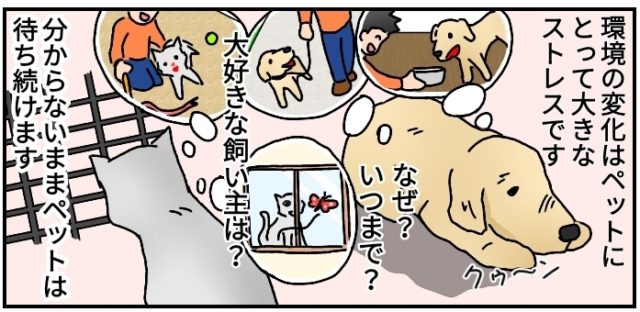 『引っ越し』は、毎日飼主さんが帰ってくることを学習し、やがてペットも慣れる出来事ですが、同じように環境がガラッと変わる(飼主の匂いや帰宅もない)ホテルなどの「一時預かり」となると、その不安やストレスもひとしおですね。