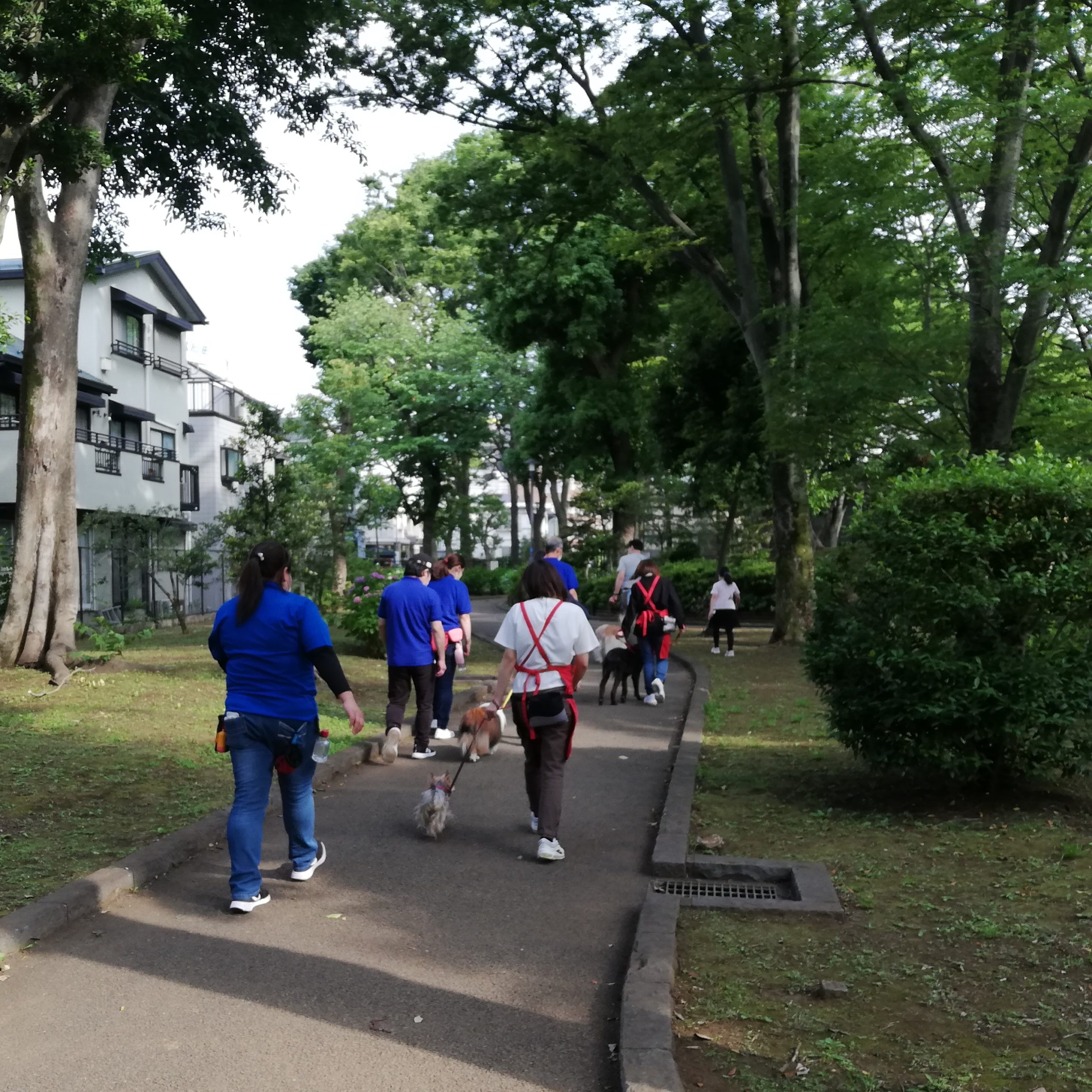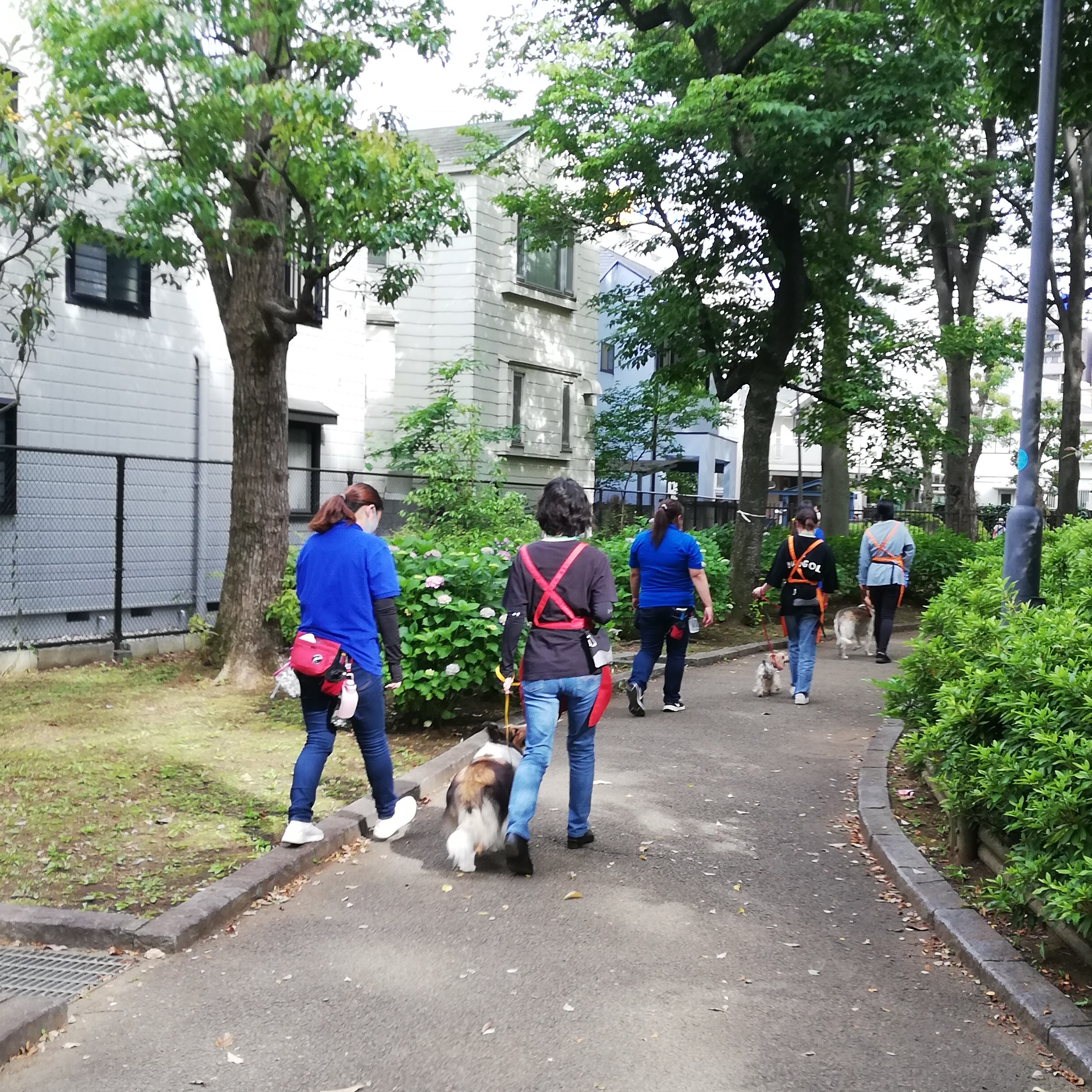 室内でハンドリングやリードの持ち方などを教わったら、近くの公園へお散歩に行きます。