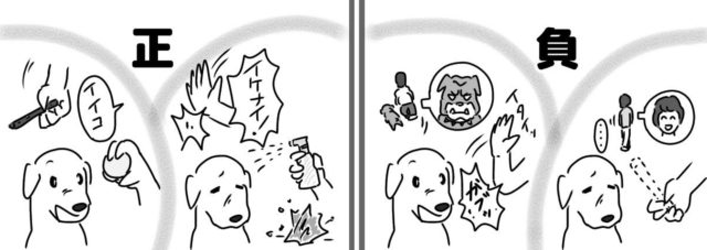 『正』や『負』という漢字から(正)「正しい/正攻法」または(負)「ネガティブ/望ましくない」しつけ方法を連想しそうですが、この場合の「正」と「負」とは、行動の後に<ある刺激>が出現(=正)するか消失(=負)するかの、プラスマイナスの(+正-負)を意味しています。