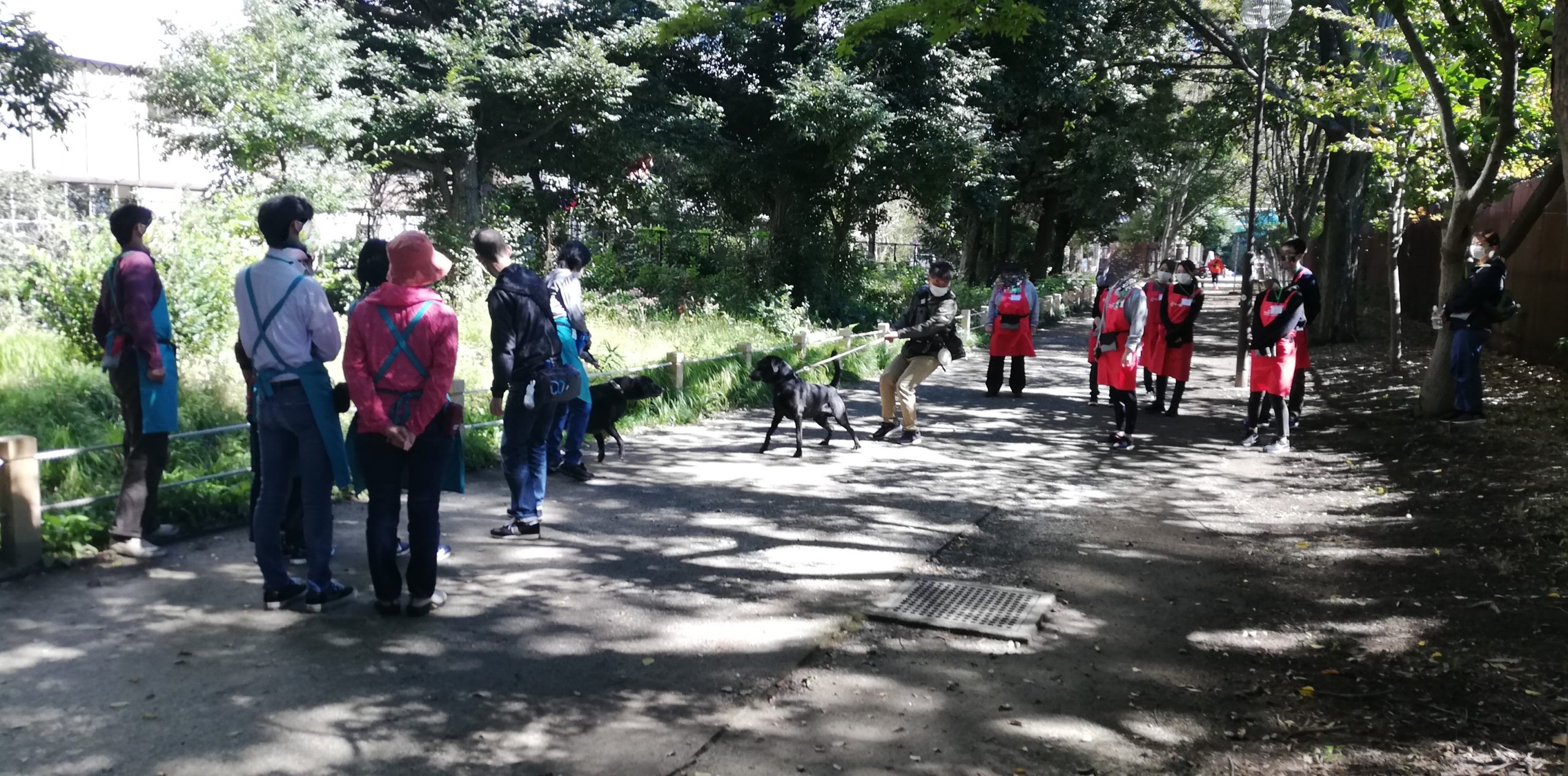 途中で班同士が会うことも。犬同士が会うとワンちゃん達の引っ張りが強くなるので、その場合はどのように対処すればよいのかを教わっています。