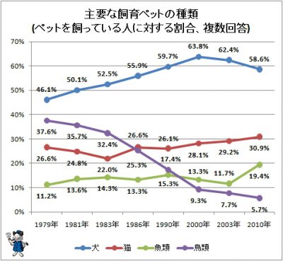 別に飼育率を競っているわけではありませんので、“=鳥の不人気”と直結させるわけではありませんが、他のペットと比べても著しい変化が見られます。