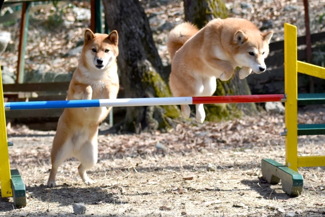 ハードルやトンネル、シーソーなどの障害物をひとつずつクリアしながら走っていく、犬の障害物競走。