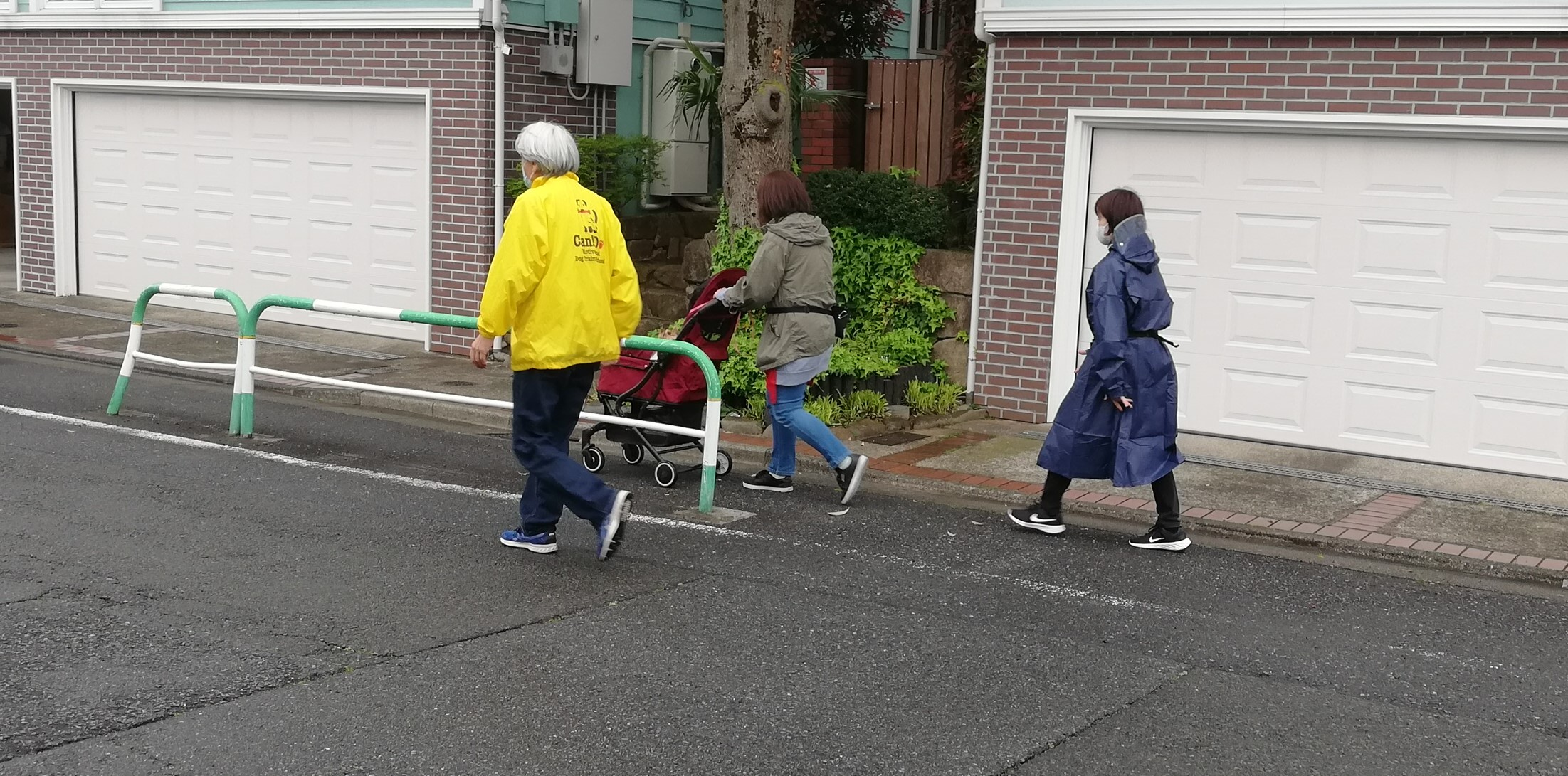 少し室内で実習を行った後、まだ小雨だったことから「先にお散歩へ!!」と号令がかかり、生徒さんと共にレインコートを着たり傘を片手に犬のお散歩へ。