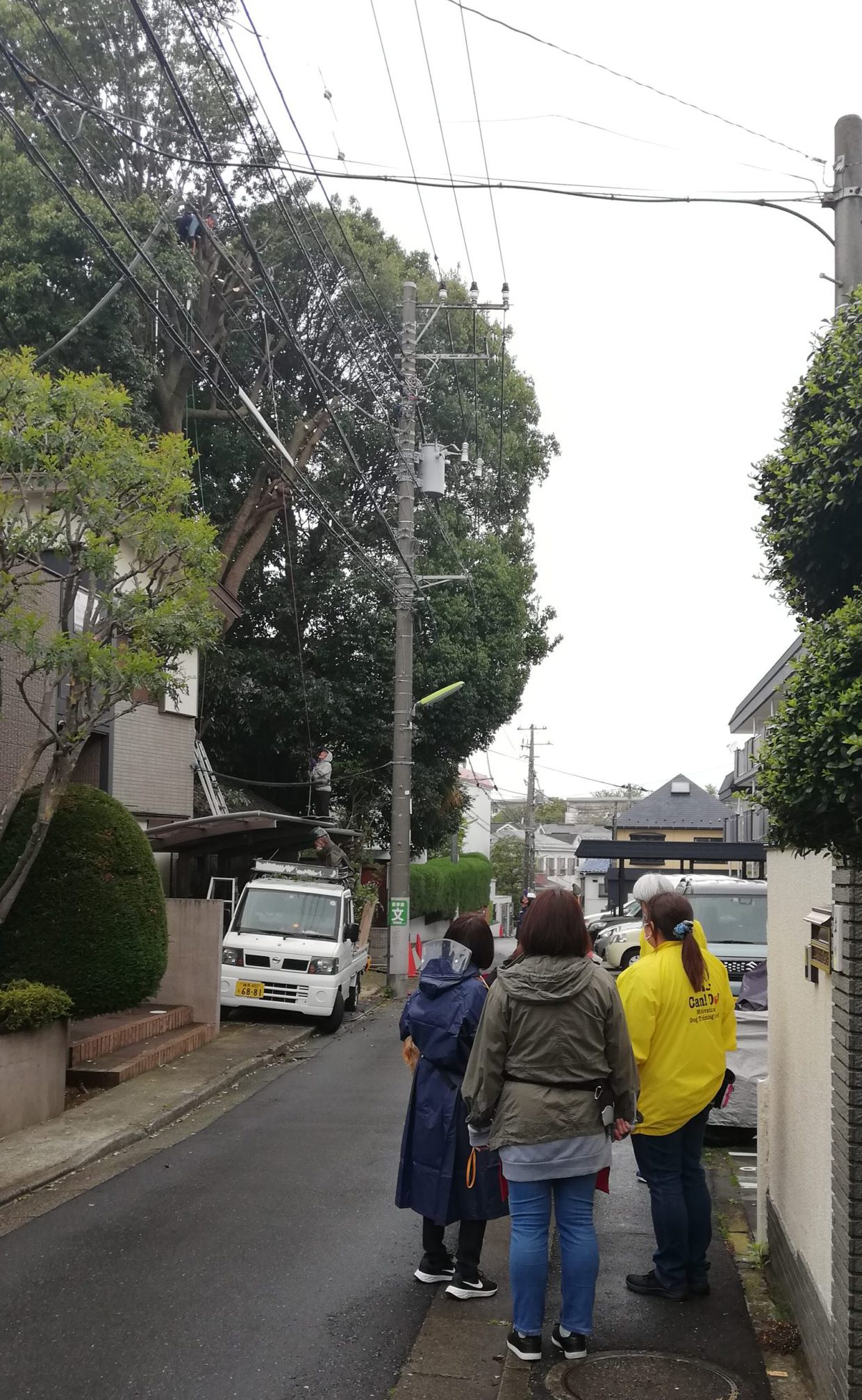 このお散歩では、子犬を外の環境(刺激)に慣らすのも目的の一つです。今回、お散歩の途中で大きな木の伐採をしている現場に遭遇。良い機会だと伐採現場を近くで見学させてもらいました。大きな音が出るこういった作業現場は、社会化期の子犬へも大切な経験になります。(個人的にも高い木の上に登り、伐採されている作業員さんの姿は見ごたえがありました。写真では分かりにくいですが、木の上の方に作業員さんが登っていらっしゃいます。)