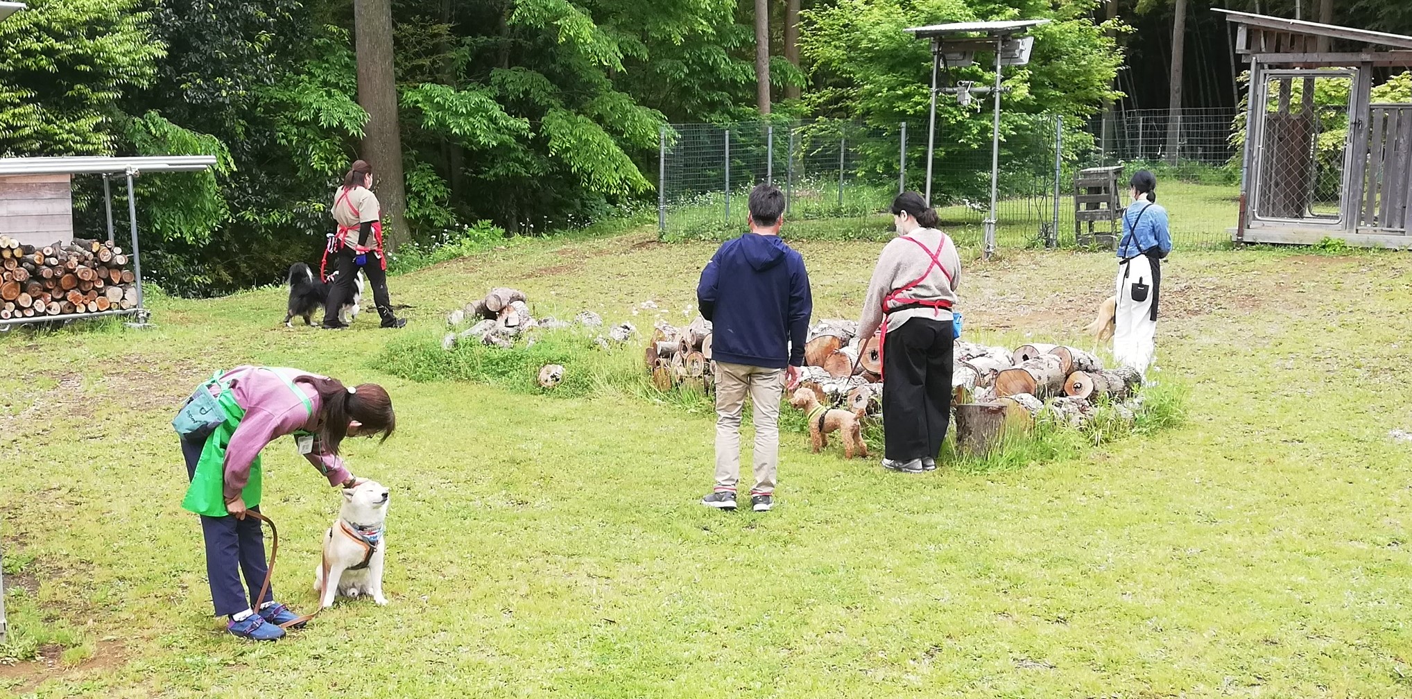お庭でワンちゃん達と触れ合いながら学んでいきます。