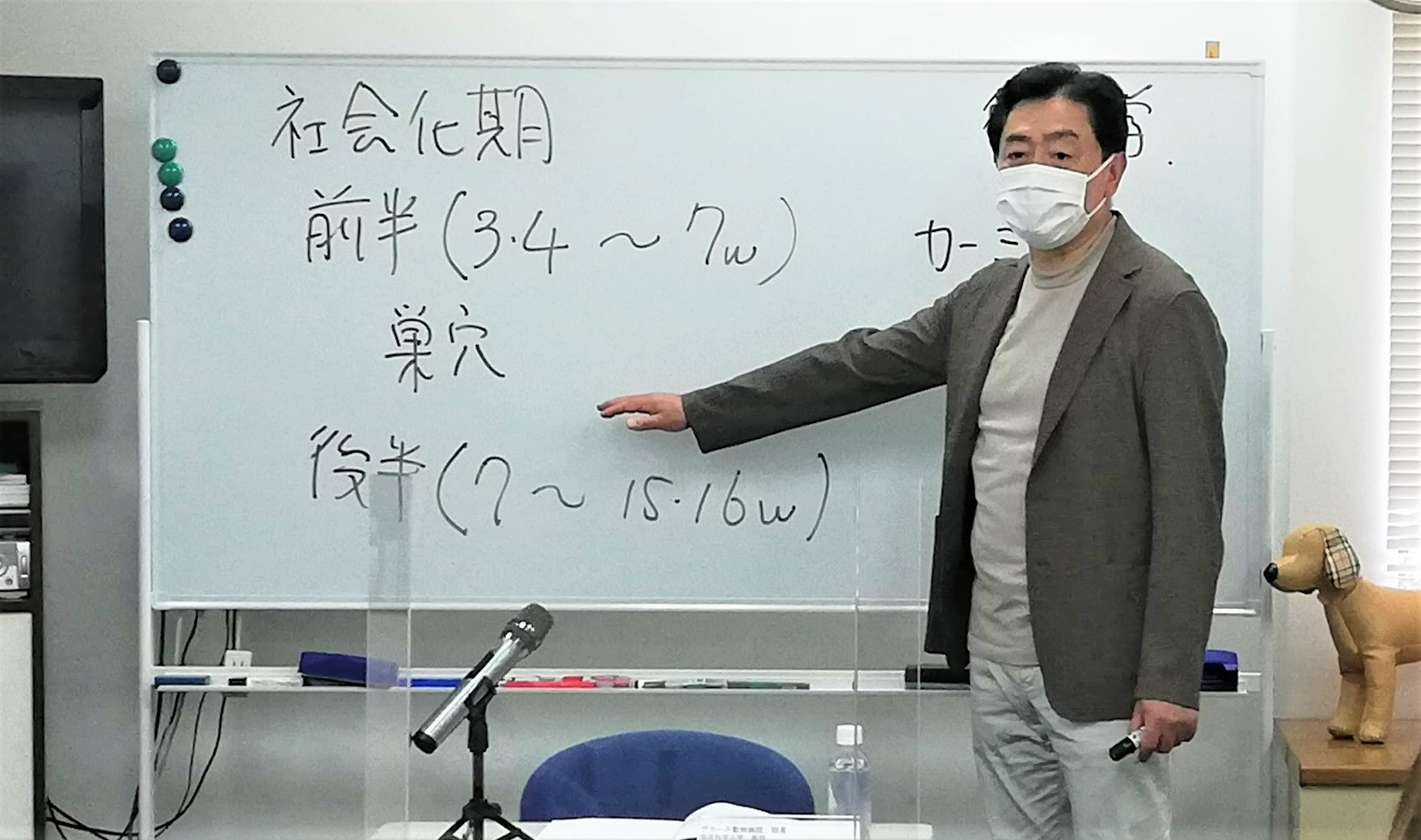 この講義はパピーの時期に特化したもので、気を付けたい病気や子犬の基本的な社会化トレーニングについて学びます。
