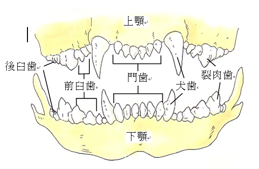 成犬では通常、上顎に切歯6本、犬歯2本、前臼歯8本、後臼歯4本、下顎に切歯6本、犬歯2本、前臼歯8本、後臼歯6本があり、合計42本の歯があります(子犬の乳歯は28本)。