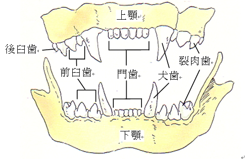 また、成猫は犬より少なく上顎に切歯6本、犬歯2本、前臼歯6本、後臼歯2本、下顎に切歯6本、犬歯2本、前臼歯4本、後臼歯2本の計30本の歯あります(子猫の乳歯は26本)。