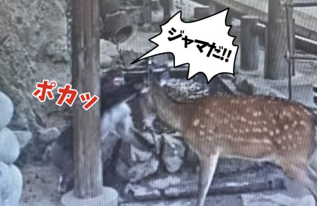 ここでは鹿も飼育されていて、猿がカッコンに興じていると、おこぼれに与ろうと鹿も寄ってきたりします。