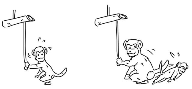 これはまさにオペラント条件付けと呼ばれるもので、猿も鹿も「紐を引っ張ればエサが出てくる」ことを学習しているから、積極的に報酬を得ようとその行動が強化、習慣化されるのですね。