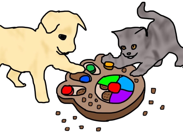 決まったタイミングでお皿に入れて出す~という一般的な方法以外にも、あえて食べづらいような(早食い防止用の)器を使ったり、コングなどの食べ物を入れるおもちゃを使うことで、ペットはより“食べる(獲る)”ことへの本能と達成感を刺激され、長い時間楽しむことができます。