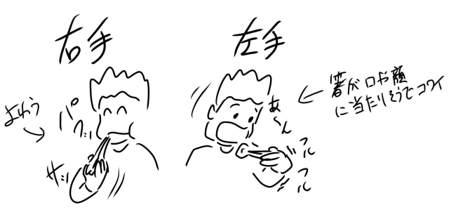 利き手(右手)であれば、口は開くだけでスムーズにそこに箸を運べますが、左手だと箸先と口までの距離感がつかめず、口から迎えに行ってしまうのです。