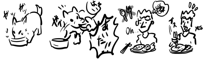 スプーンとフォークの文化圏の人に、いきなり箸を渡しても上手く扱えませんが、箸をぶっさせば食べられるように、『手』からなのか『皿』からなのかは犬にとって些末な問題で、普段通りパクつけばおいしい経験ができてしまうのです。