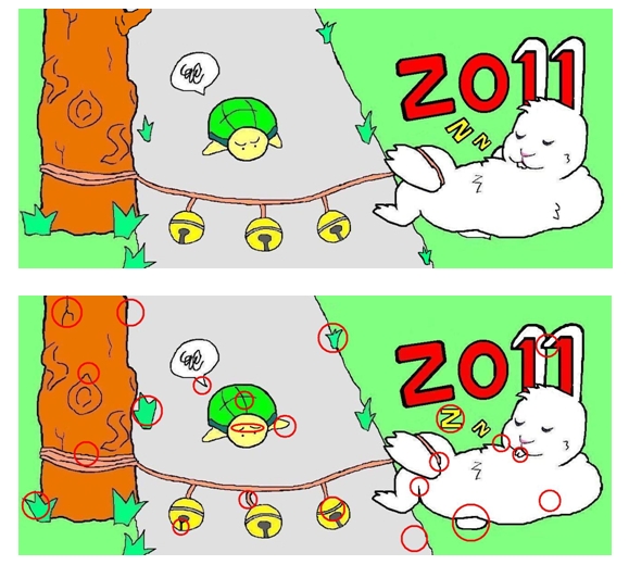 いずれも『間違い探し』をテーマにした年賀状となっていますが、こうした「間違い探し」を右見て左見て・・ここが違うぞ・・あと何個だ・・?なんてちまちま時間をかけることなく、一瞬で魔法のように見つけることができるのです。そう、マジカルアイならね。
