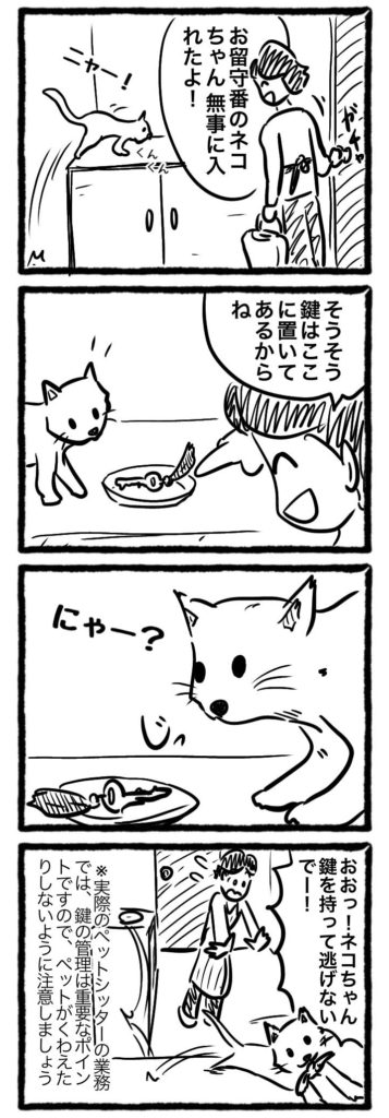 1コマ目: キャラクターA(ペットシッター): 「お留守番のネコちゃん、無事に入れたよ!」 ネコちゃん: 「ニャー!」(キャラクターAににおいを嗅ぎながら近づいている) 2コマ目: キャラクターA: 「そうそう、鍵はここに置いてあるからね」 (キャラクターAが鍵を置いている場所を指差し、ネコちゃんが興味津々で見ている) 3コマ目: ネコちゃん: 「にゃー?」(ネコちゃんが鍵をじっと見つめている) 4コマ目: (ネコちゃんが鍵をくわえて逃げ出してしまう様子が描かれている) キャラクターA: 「おおっ!ネコちゃん、鍵を持って逃げないでー!」 (四コマ漫画の終わり) ※注意:実際のペットシッターの業務では、鍵の管理は重要なポイントですので、ペットが鍵をくわえたりしないように注意しましょう。この漫画はフィクションですので、安全に注意しながら楽しむことをお勧めします。 |