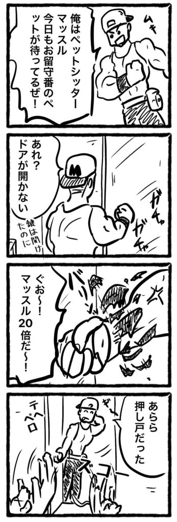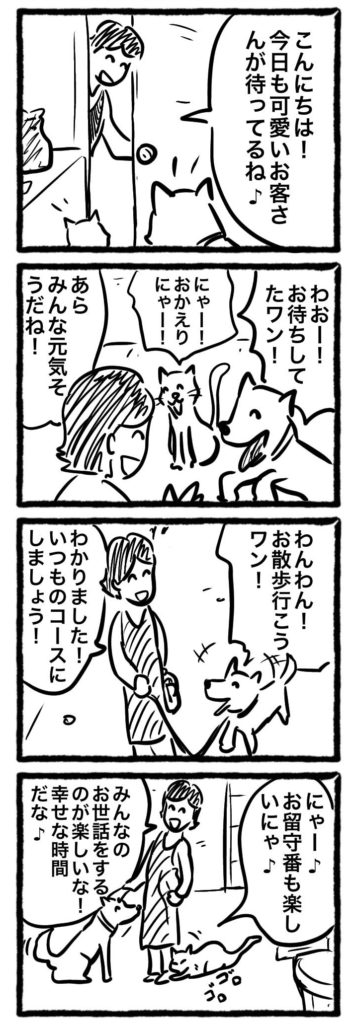 ペットシッターの四コマ漫画は、ペットのかわいらしさとシッターの聡明さ、そしてそれらが融合して生まれるハートフルな物語が、春のそよ風のように心地良く響くもの。最後にそんなヒューマニズムな私の四コマ漫画をご覧ください。