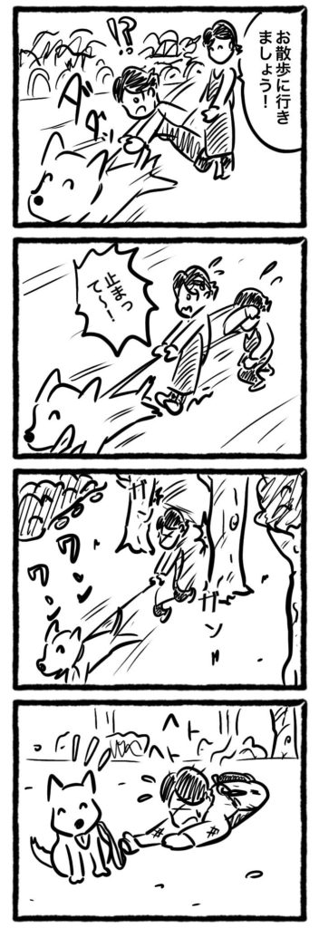 【1コマ目】 ペットシッター: 「お散歩に行きましょう!」 ペット: (リードを引っ張りながら全速力で走り出す) ペットシッター: (びっくりして転げ落ちる) 【2コマ目】 ペットシッター: (汗だくで立ち上がりながらリードを引っ張る) ペット: (嬉しそうに舌を出しながら走り続ける) ペットシッター: 「止まって~!」 【3コマ目】 ペットシッター: (ペットを追いかけて木にぶつかりながら走る) ペット: (ワンワン!) 【4コマ目】 ペットシッター: (疲れ切って倒れ込む) ペット: (満足そうに舌を出しながらそばでくつろぐ) |
