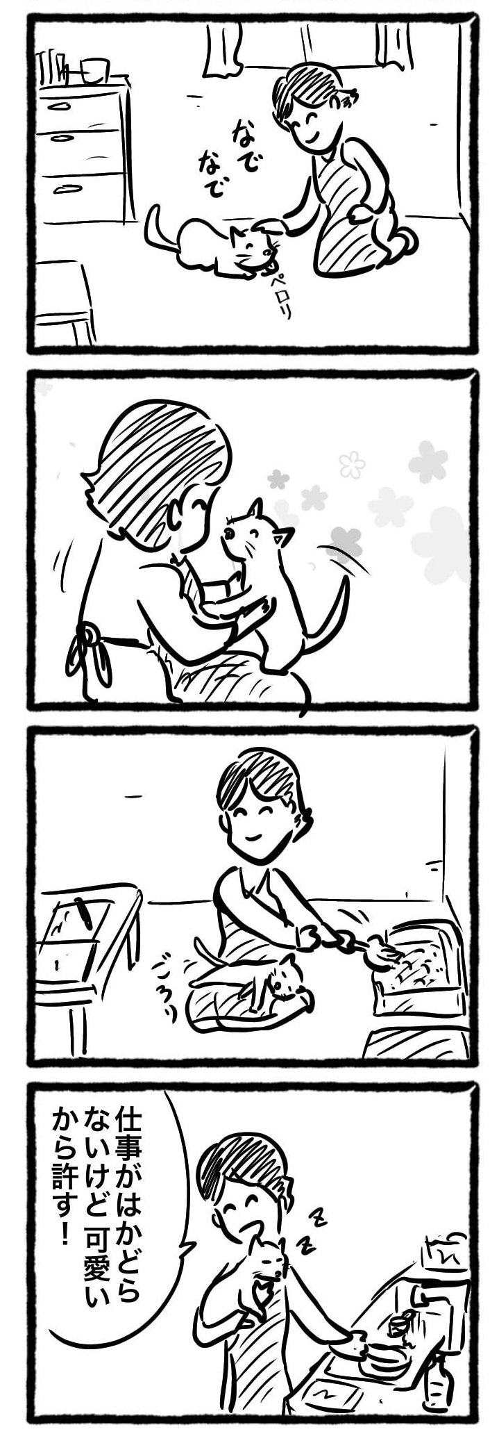 【1コマ目】 ペットシッター: (ペットを撫でている) ペット: (嬉しそうにペロリと舌を出す) 【2コマ目】 ペットシッター: (ペットを膝の上に乗せる) ペット: (ペットシッターの顔に顔を寄せる) 【3コマ目】 ペットシッター: (仕事をしながらペットが膝の上にいる) ペット: (ごろりと横になってくつろぐ) 【4コマ目】 ペットシッター: (ペットを抱っこしながら仕事をする) ペット: (満足そうにスヤスヤと眠りにに入る) ペットシッター: 「仕事がはかどらないけど、可愛いから許す!」 |
