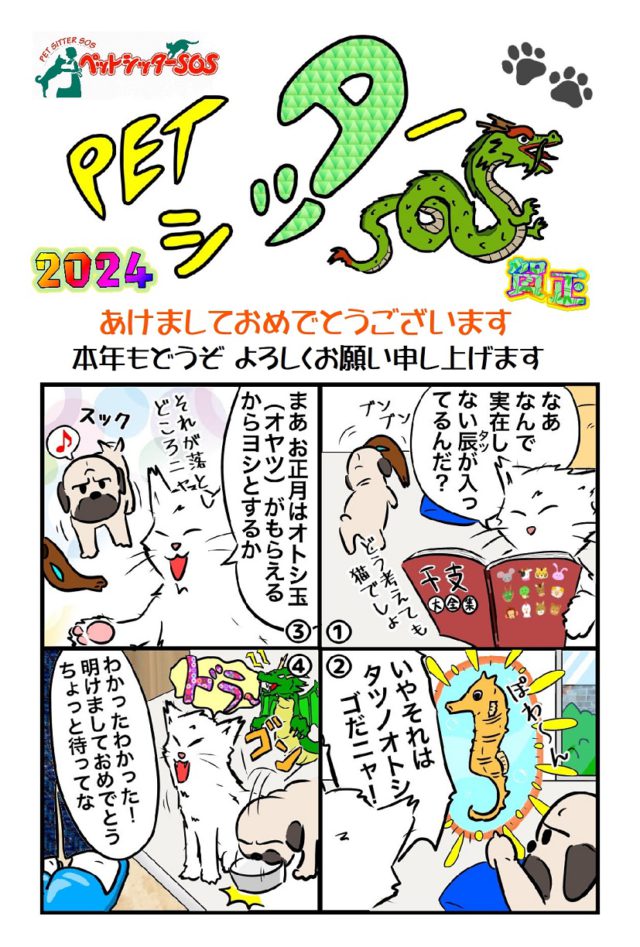 今年も龍のように高みを目指し、たくさんの皆様に安心安全のペットシッターサービスをお届けしていきたいと思っておりますので、本年もどうぞペットシッターSOSをよろしくお願い申し上げます。