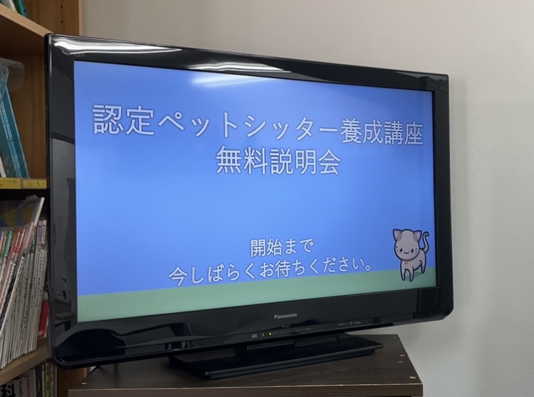 本日の説明会はペットシッタースクール教室で行っており、このようにTV画面とペットシッタースクール資料を使ってお話させていただいております。