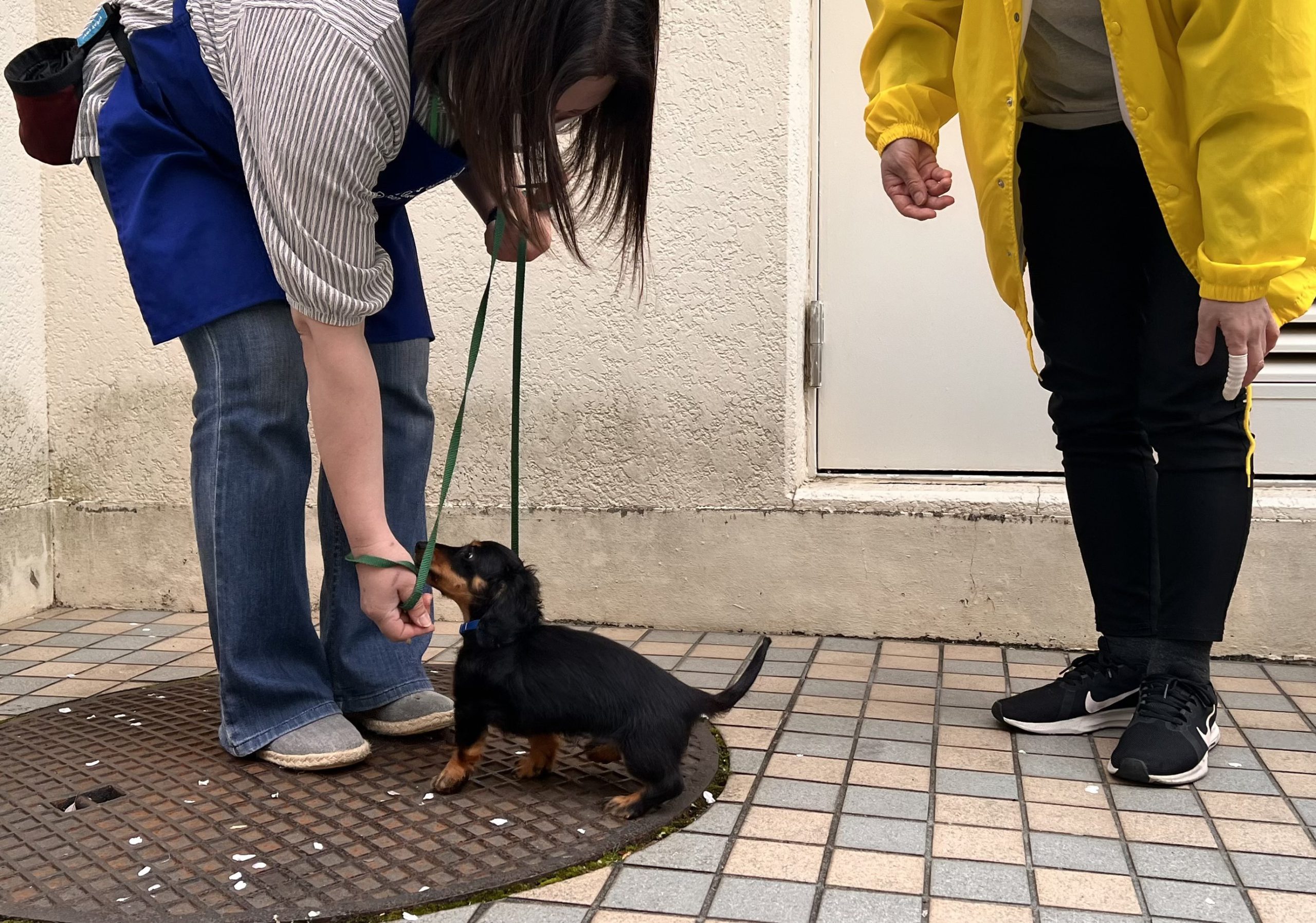 授業では、パピーの抱き方から物や音への慣らし方、お散歩方法を学んでいきます。