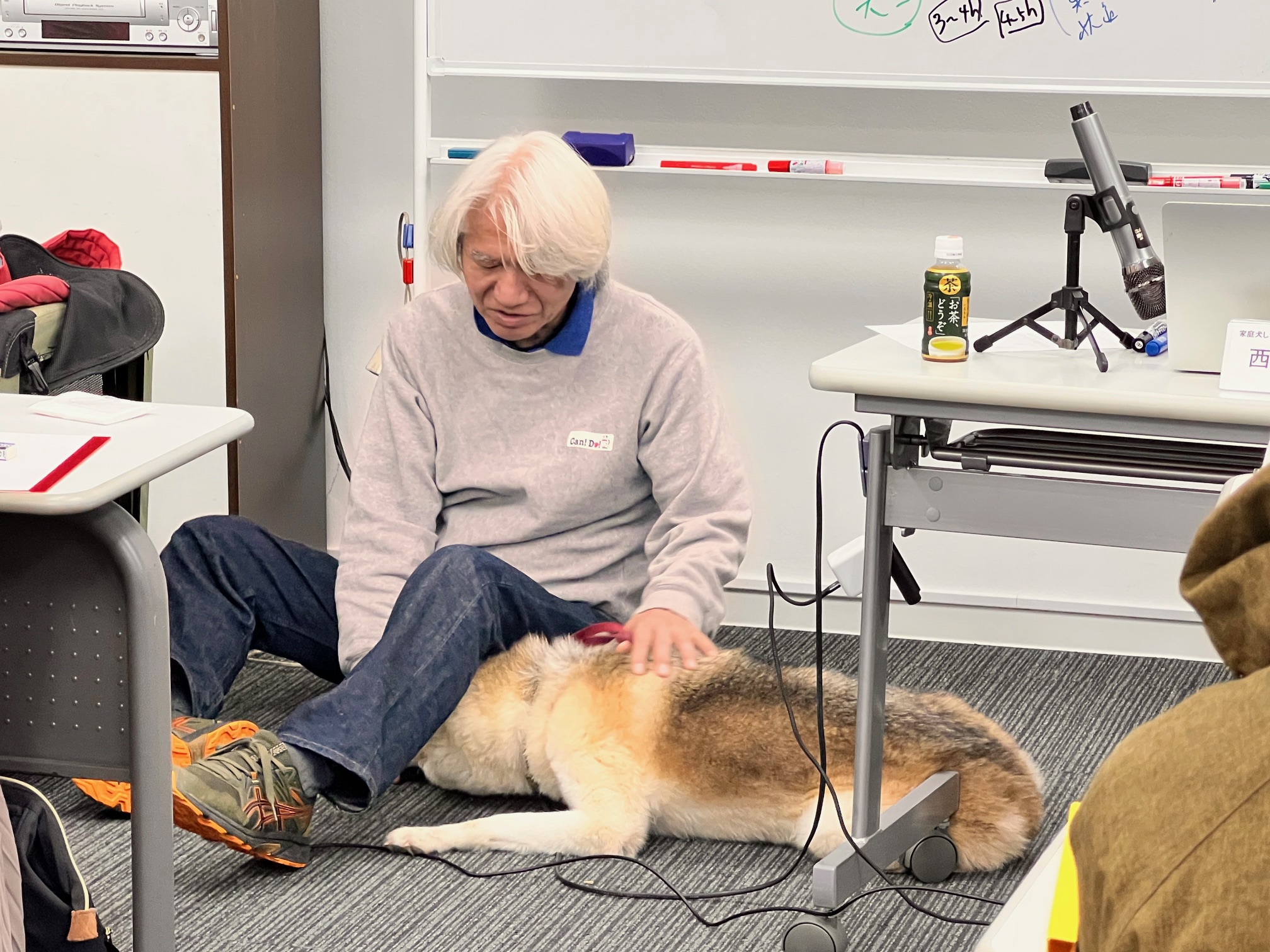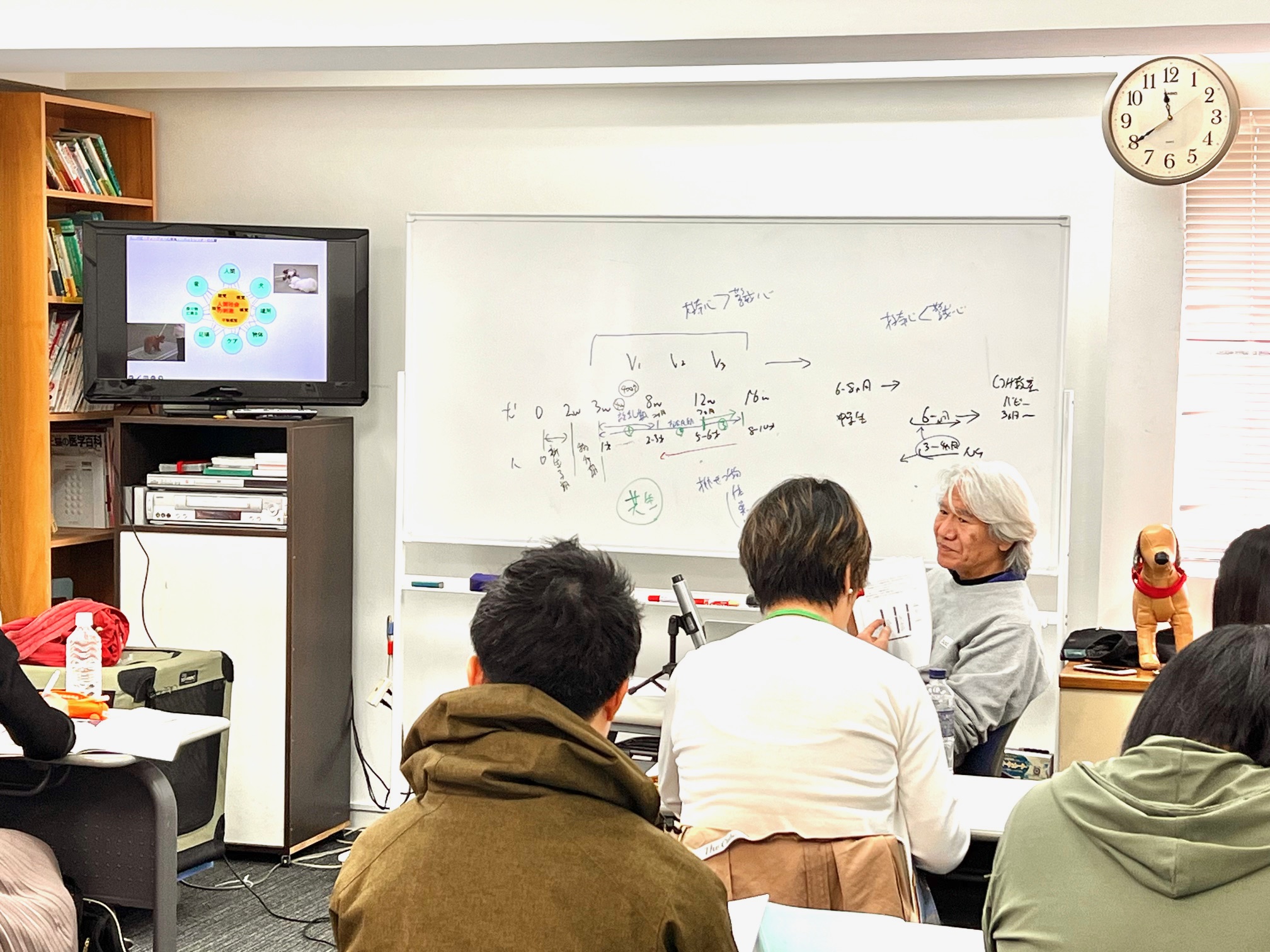 講師を務めてくださるのは、実習でもお世話になりました犬のしつけ教室「 Can ! Do ! Pet Dog School 」代表の西川文二先生です。明日から始まる「パピーのしつけ実習」前の大事な授業となり、子犬の社会化トレーニングについて学びます。