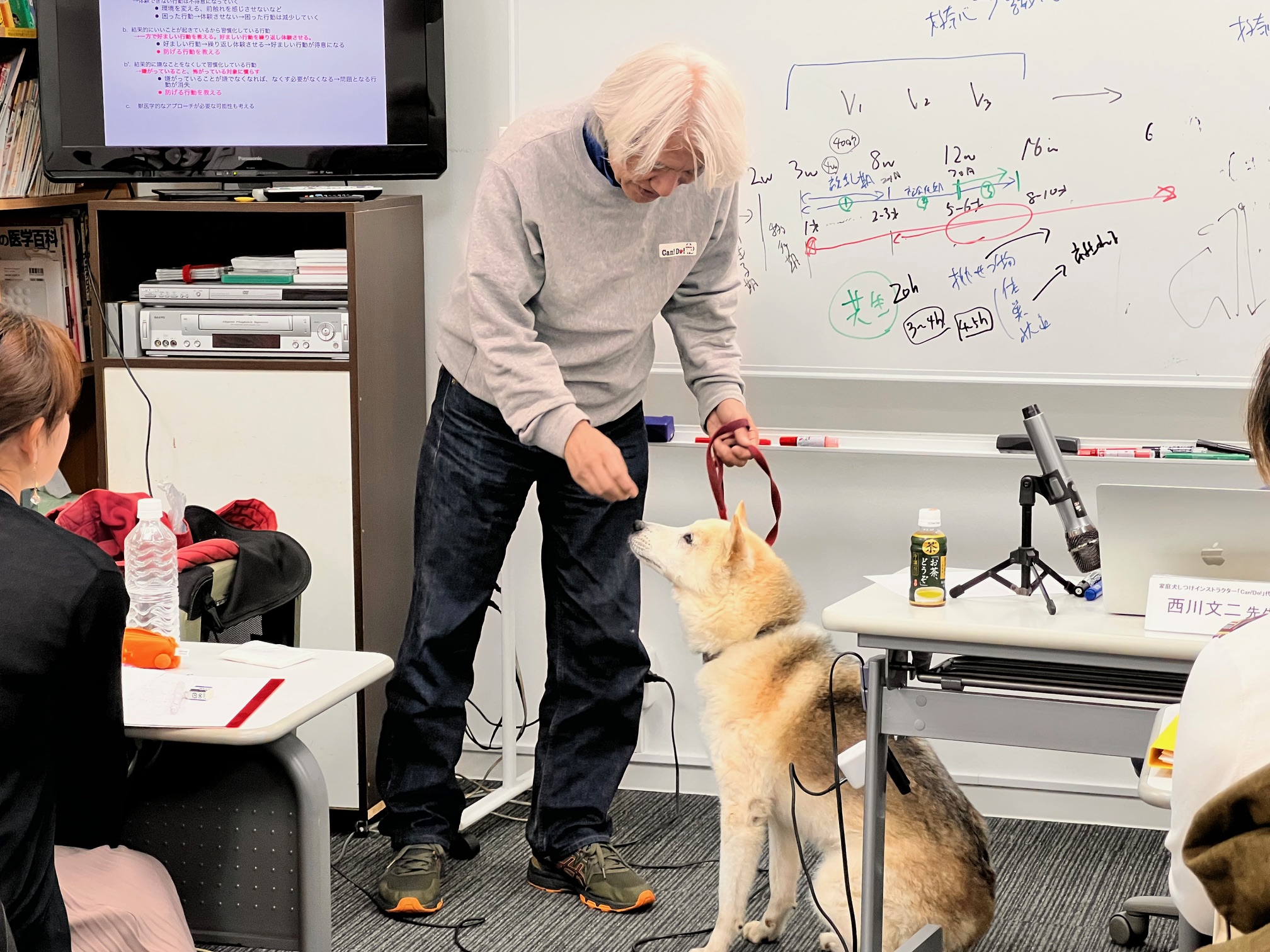 講師を務めてくださるのは、実習でもお世話になりました犬のしつけ教室「 Can ! Do ! Pet Dog School 」代表の西川文二先生です。明日から始まる「パピーのしつけ実習」前の大事な授業となり、子犬の社会化トレーニングについて学びます。