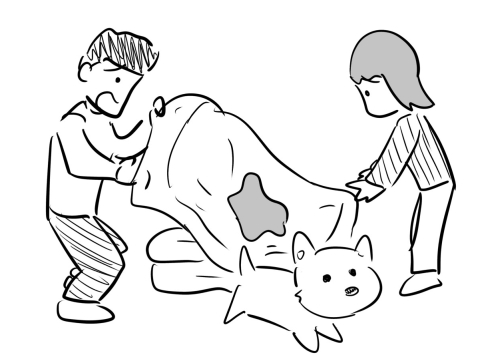 「おいおい!寝室に入っておしっこしちゃったぞ!奮発して買った高級羽毛布団だから、すぐに手入れしないと大変だ!あー、せっかくの休みが~」