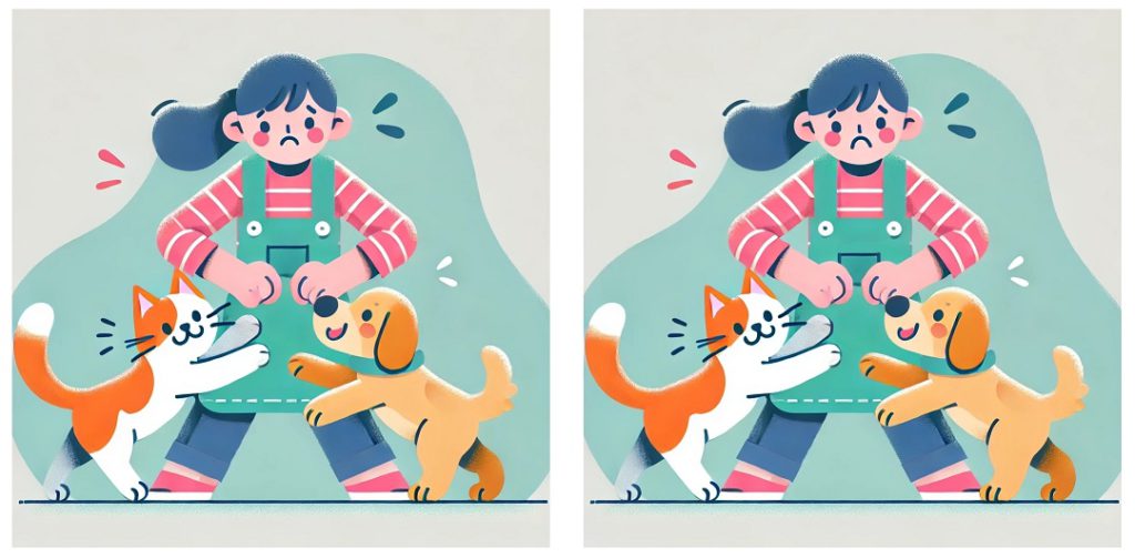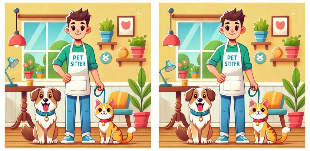 前回のブログで作成したら、AIに作らせてめちゃくちゃ簡単にできましたので、今回は難易度赤ちゃんから仙人まで、レベル別「ペットシッターイラスト間違い探し」を取り揃えました。
