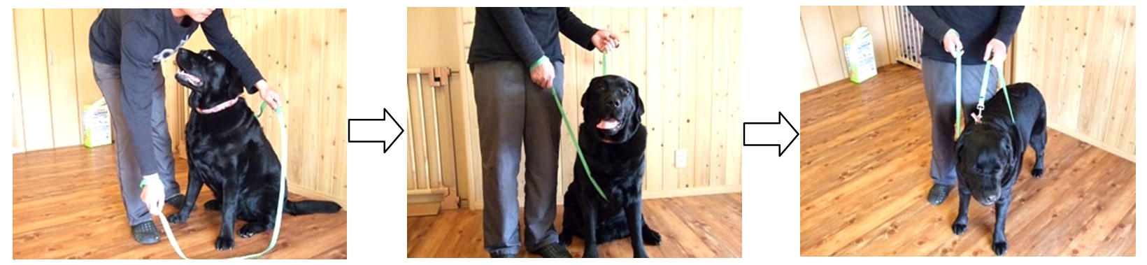 犬の背中からリードを回し、足の間に通す。通した先端(リードの持ち手)と背中側のリードを両手で持って、犬の体全体を持ち上げるようにする