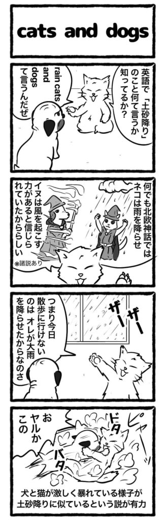 雨と言えば、英語で大雨のことを「rain cats and dogs」と言ったりします。