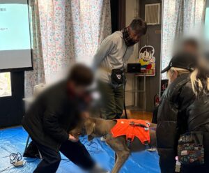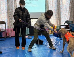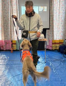 午前中に学んだ内容を大型犬のわんちゃんにご協力いただき実践していきます。
